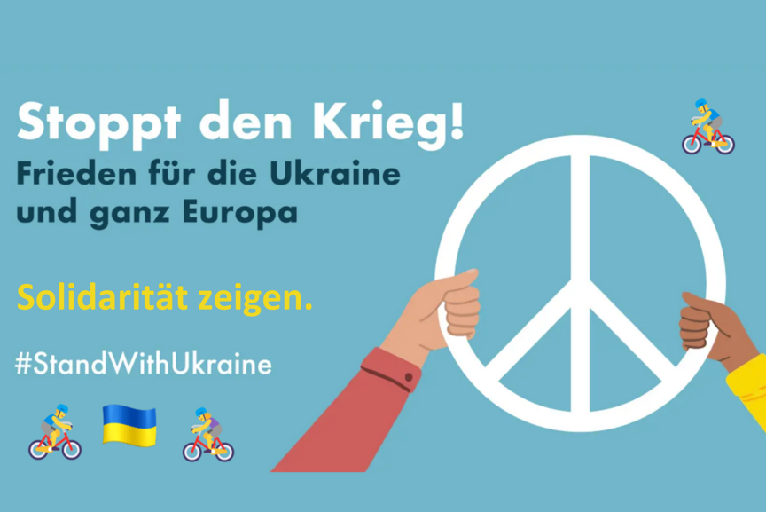 Wir denken an die Menschen in der Ukraine und zeigen uns solidarisch, indem wir uns dem Bündnis "Stoppt den Krieg! Frieden für die Ukraine und ganz Europa" angeschlossen haben. In dem Bündnis fordern wir die russische Regierung auf, sofort alle Angriffe einzustellen, sich aus der Ukraine zurückzuziehen und deren territoriale Integrität wiederherzustellen. Sie muss zum Verhandlungstisch zurückkehren.